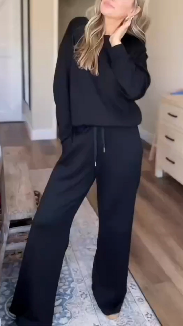 This casual two piece set is designed for easy, no-fuss styling that fits naturally into everyday life. With a relaxed top and matching bottoms, it delivers a clean, balanced look that works for home wear, errands, or casual outings.