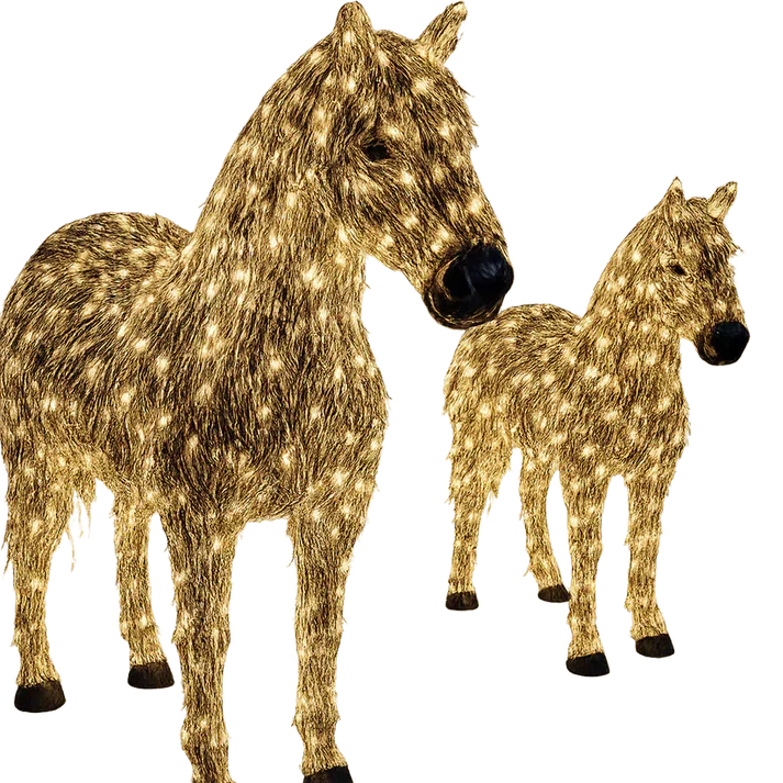 Grace your approach with an illuminated pair that captures the quiet power of the horse and the tenderness of its foal. This life-sized duo shimmers with hundreds of warm white points of light, their refined silhouettes feeling sculptural by day and irresistibly inviting after dusk. Weather-ready and crafted to endure, it brings year-round ambience to gardens, driveways, porches and estates with effortless sophistication.